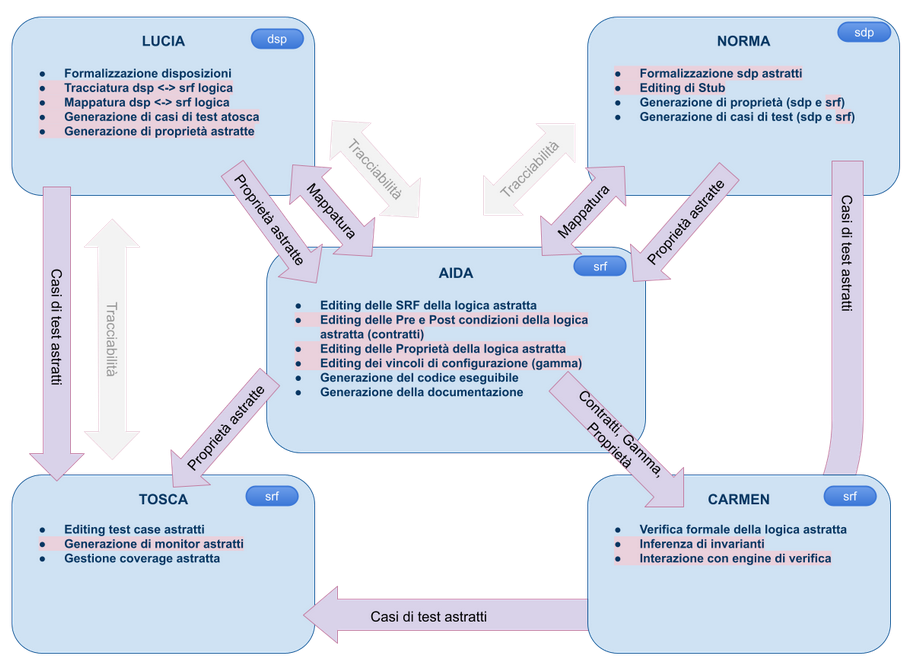 LUCIA for the formalization of the textual dispositions and regulatory. LUCIA can generate test cases and properties out of the formalized documents.